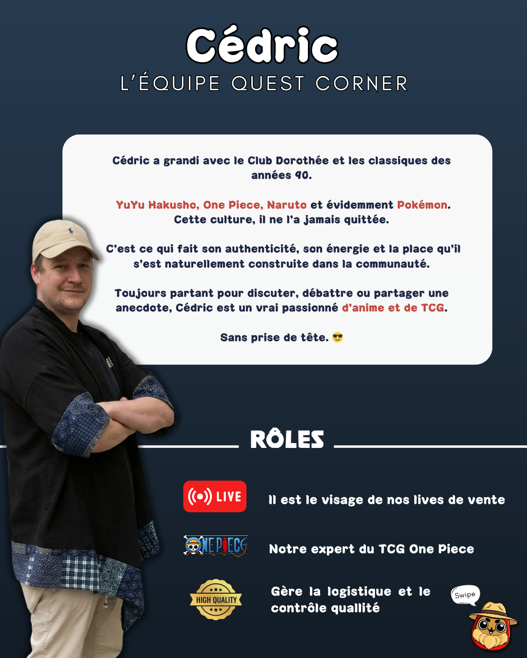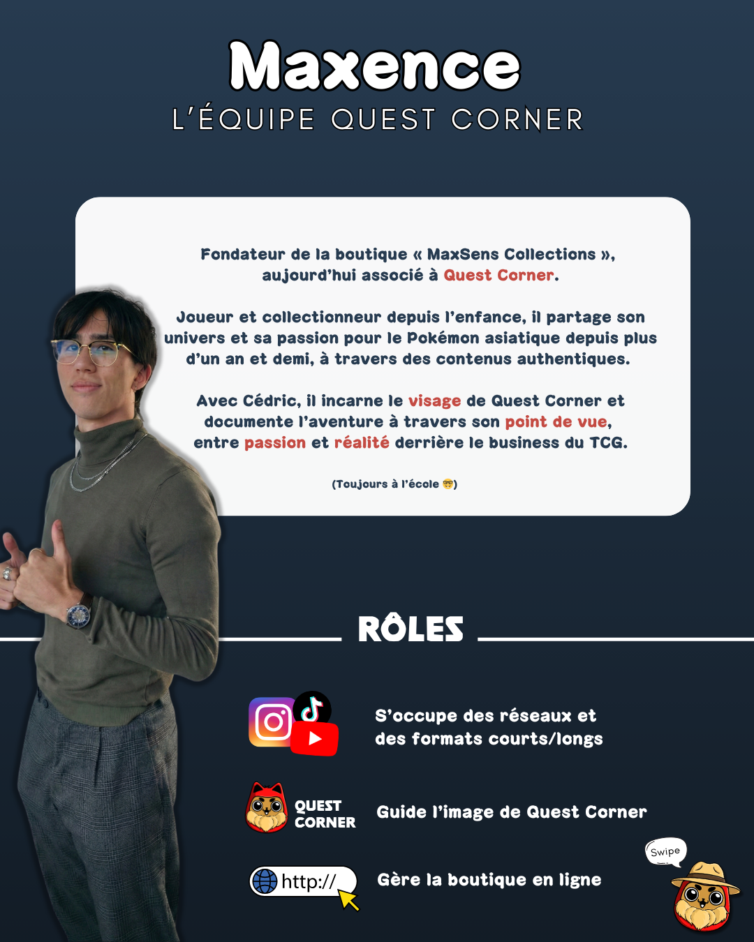 Aujourd’hui, il est le visage de nos lives de ventes : celui qui fait vivre l’expérience en direct, qui crée le lien avec la commu et qui amène cette énergie positive dans chaque interaction. Et demain, il continuera d’élargir ce rôle sur d’autres canaux, toujours avec le même objectif : partager sa passion et faire vivre la communauté Quest Corner.