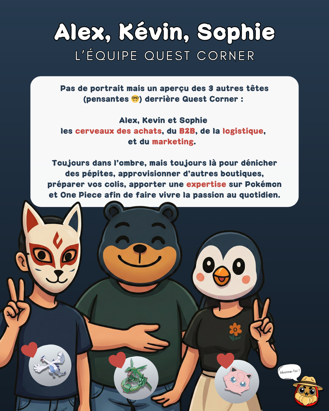 Derrière Quest Corner, il y a cinq passionnés de TCG et de pop culture. Des collectionneurs avant d’être vendeurs, qui ont voulu construire un projet sincère, fiable et durable.